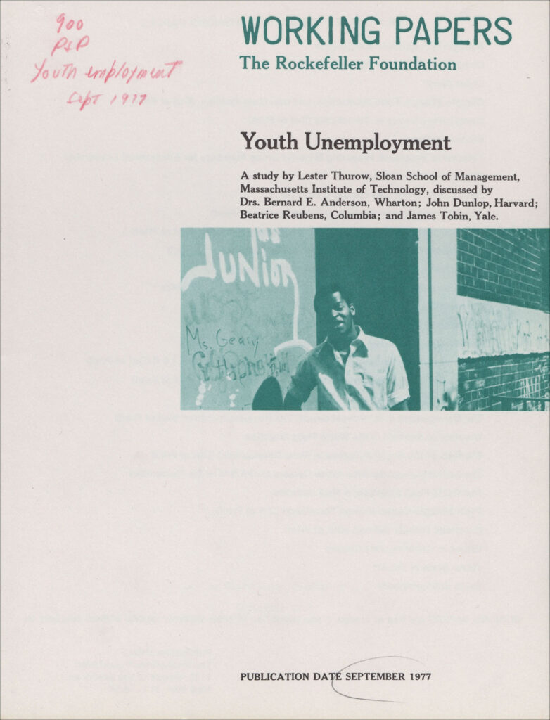 These foundation officers began by commissioning a background paper on the problem of youth employment. Authored by political economist Lester Thurow, of MIT’s Sloan School of Management, the paper became the basis of a conference on “Unemployment of Youth and Policy Alternatives,” held at the Rockefeller Foundation in May 1977. Discussants included Rockefeller Foundation Social Sciences Director Bernard E. Anderson, United States Secretary of Labor John Dunlop, labor economist Beatrice Reubens, and economist James Tobin.