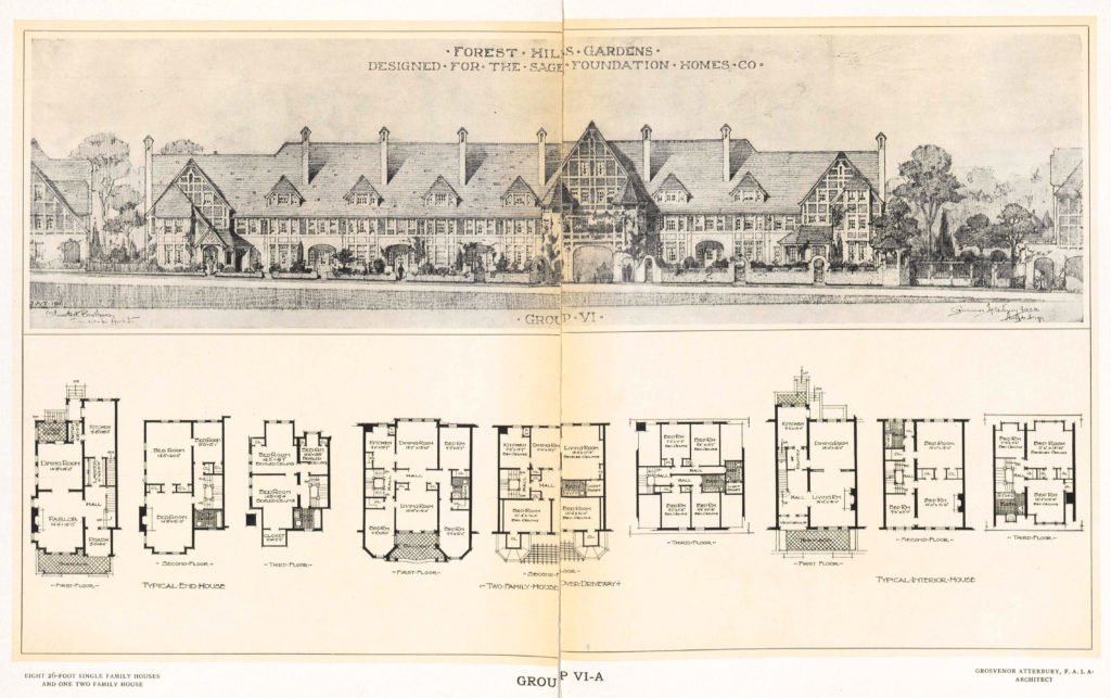In 1909, the Foundation formed the Sage Foundation Homes Company, with none other than de Forest at the helm. The company purchased nearly 150 acres of land in Queens and hired architect Grosvenor Atterbury (who had designed de Forest’s home on Long Island) and landscape architects John Charles Olmsted and Frederick Law Olmsted, Jr. to draft the plans.For more on the planning and development of Forest Hills, see “Early Office Files,” Russell Sage Foundation records Series 3, Rockefeller Archive Center.