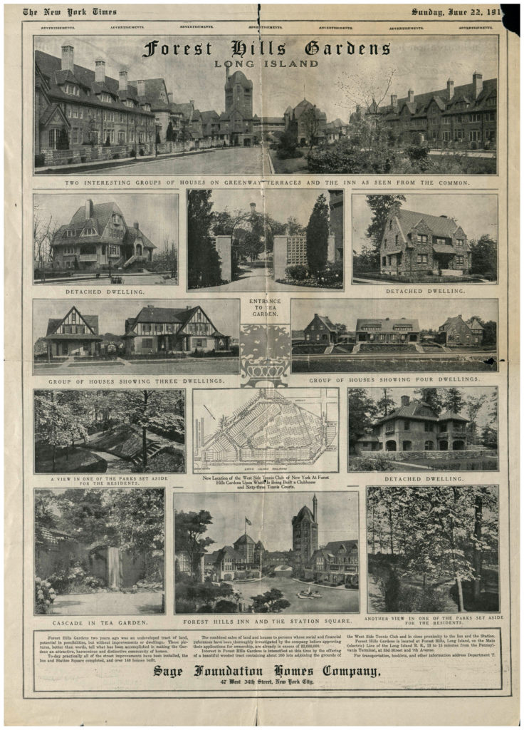In his pitch to potential buyers, de Forest was careful to promote the project as a “business investment of the Russell Sage Foundation […] conducted on strictly business principles for a fair profit.” To drive the point home, he emphasized, “it is not a charity.”Robert de Forest, “Forest Hills Gardens. What it is, Why it is, and What it is not.” Russell Sage Foundation records, Rockefeller Archive Center.