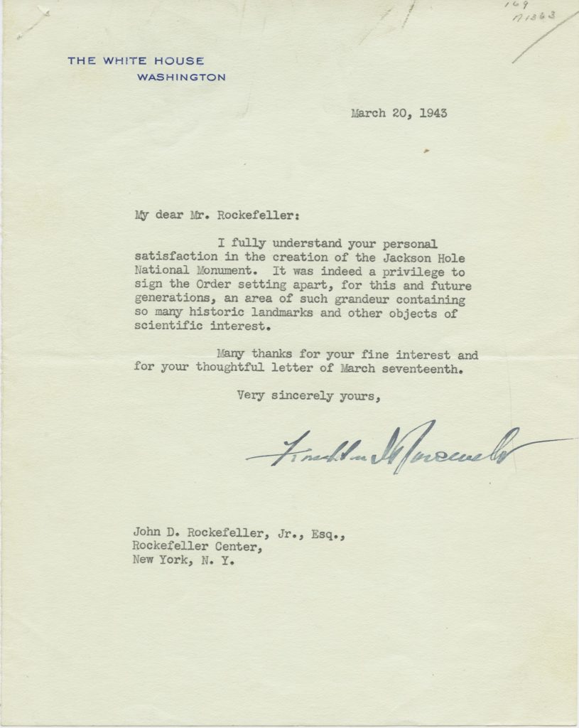 Quickly responding, President Franklin D. Roosevelt mobilized and issued an executive order to incorporate Rockefeller’s land into the new 221,000-acre Jackson Hole National Monument in 1943. Roosevelt claimed authority under the 1906 Antiquities Act, a broad statue allowing presidents to create national monuments on lands containing “historic landmarks, historic and prehistoric structures, and other objects of historic or scientific interest.”National Park Service, “Creation of Grand Teton National Park”; National Park Service, “American Antiquities Act of 1906.”