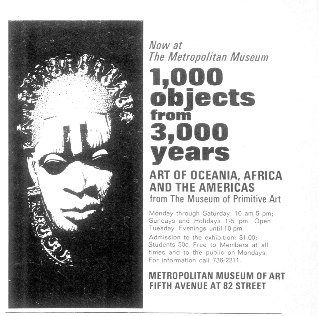 Advertisement for the Museum of Primitive Art’s Spring 1964 exhibit: Seafarers of New Guinea: Art of the Massim Area, featuring a turtleshell lime spatula