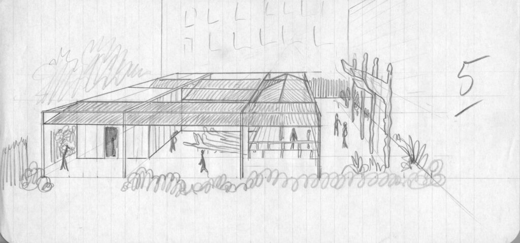 Design sketches of the outdoor pavilion which would house Michael Rockefeller’s collection of Asmat art.