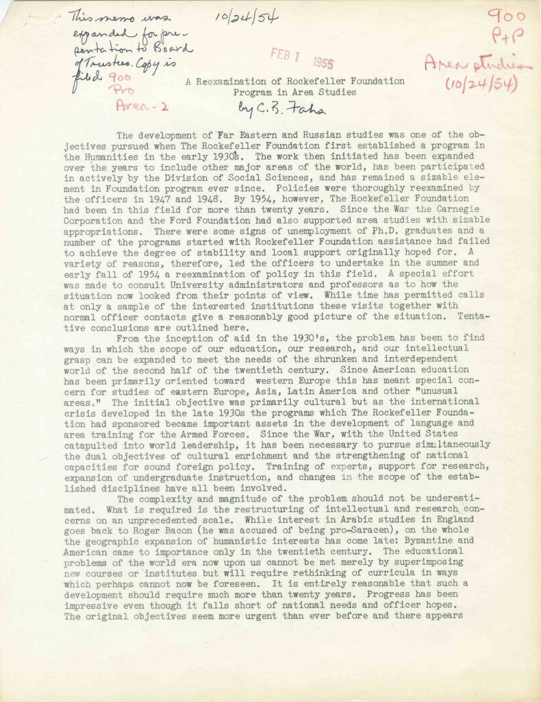 Fahs believed this to be especially important in what he described as “the shrunken and interdependent world.”Charles B. Fahs, “A Reexamination of the Rockefeller Foundation Program in Area Studies,” October 24, 1954. Rockefeller Archive Center (RAC), RG 3.2, Series 900, Box 31, Folder 165.