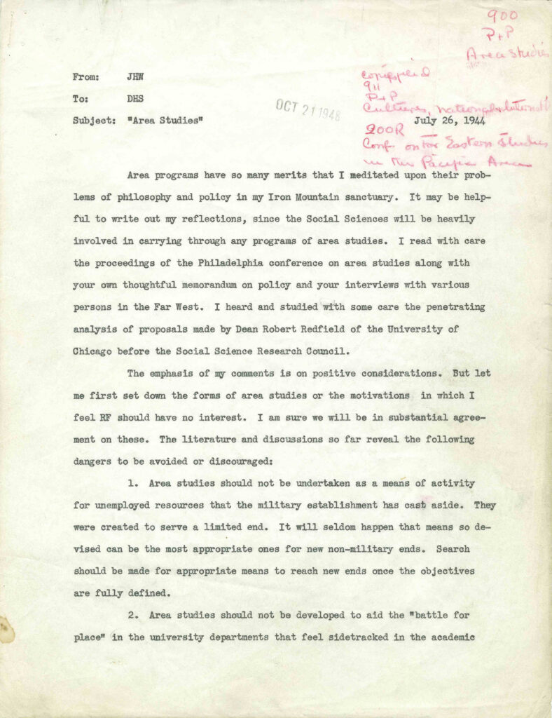 Officers and prominent scholars alike worried that the new approach might mistake a hodgepodge of facts for the deep expertise of the academic fields. Joseph H. Willits, director of the Foundation’s Division of Social Sciences, stressed research as a guarantee against superficiality, explaining that “without research, teaching will tend to emphasize spot information and travelogue reporting which does create interest at the elementary level, but which does not lead to disciplined thinking or mastery of other cultures equivalent to the familiarity we have of our own.”Joseph H. Willits to David H. Stevens, July 26, 1944, RAC, RG 3.2, Series 900, Box 31, Folder 165.