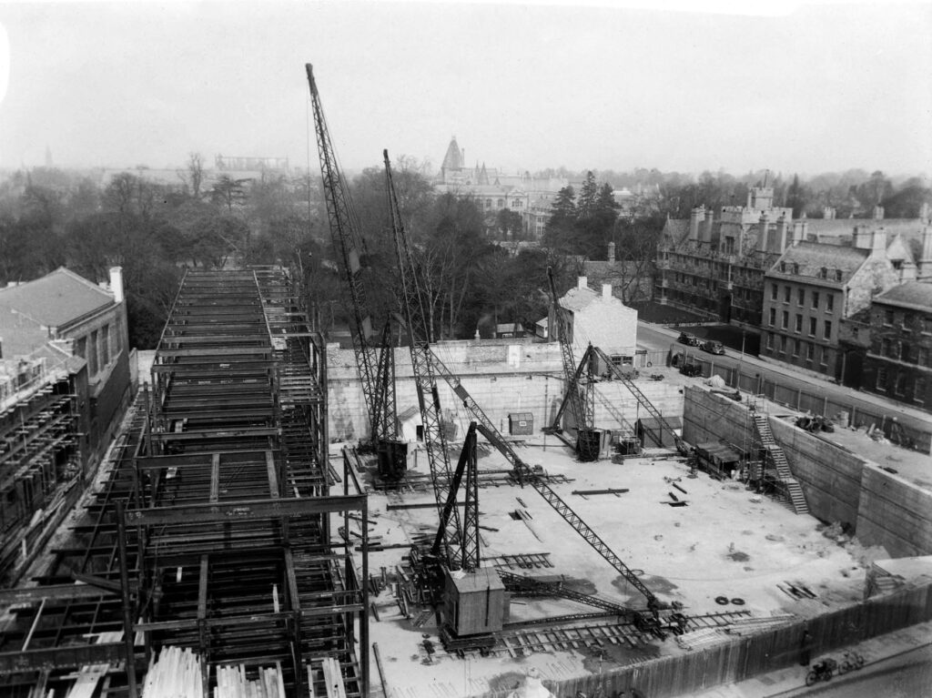 The expanded Bodleian was opened in 1946. The library had been pressed into emergency service during World War II, forcing an interruption in construction. Objects of value were stored in the library’s underground levels, and the building served as a “nerve center” for the British Navy, a job which included use of the university press to print naval codes.“The New Bodleian Library Building,” Excerpt from Trustee Bulletin, February 1947, Rockefeller Archive Center, RG 1.1, Series 401 R, Box 63, Folder 823.