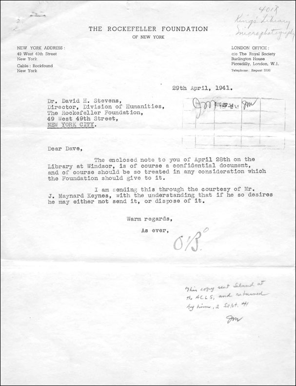 Microphotography proved to be especially useful during World War II, when the technology was used to preserve historic and irreplaceable items that were threatened with destruction during the bombing campaigns over England. In 1941 Daniel O’Brien of the Rockefeller Foundation’s Paris office contacted David Stevens regarding the urgent matter of the threatened collections in King’s Library at Windsor Castle. The extensive and valuable collections owned by Great Britain’s royal family were inventoried in a letter from O’Brien to Stevens.