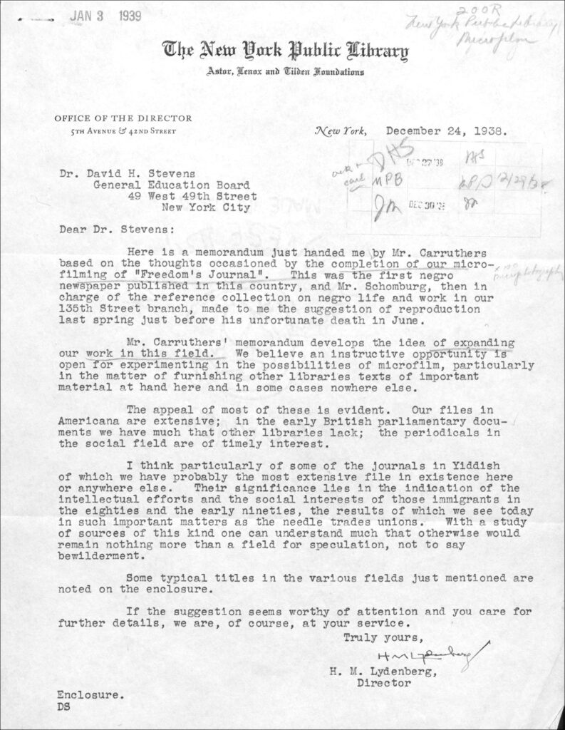 - “New York Public Library – Microfilm,” 1938-1941, 1947. Rockefeller Foundation records, Projects (Grants), Record Group 1, Subgroup 1.1, United States, Series 200, Humanities and Arts, Subseries 200.R, Rockefeller Archive Center.