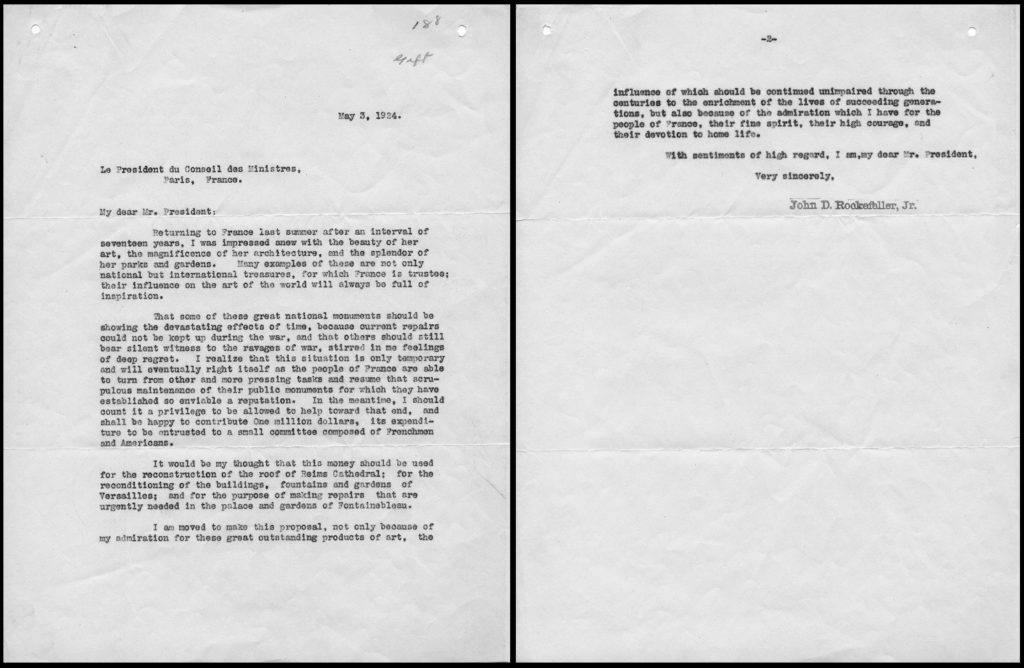On May 3, 1924, John D. Rockefeller, Jr., wrote to French Prime Minister Raymond Poincaré to make a formal offer of financial assistance for the restoration of several French national monuments. Preparations for Rockefeller’s gift, however, had been quietly in the works for months.