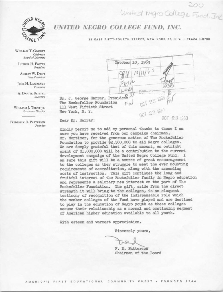 In December 1962, William Gossett, Chairman of the United Negro College Fund (UNCF), sought a meeting with Rockefeller Foundation (RF) officials to discuss an upcoming fundraising campaign.Bayard F. Pope to George Harrar, “United Negro College Fund, Inc.,” Rockefeller Foundation records, SG 1.2, Series 200, Rockefeller Archive Center.
