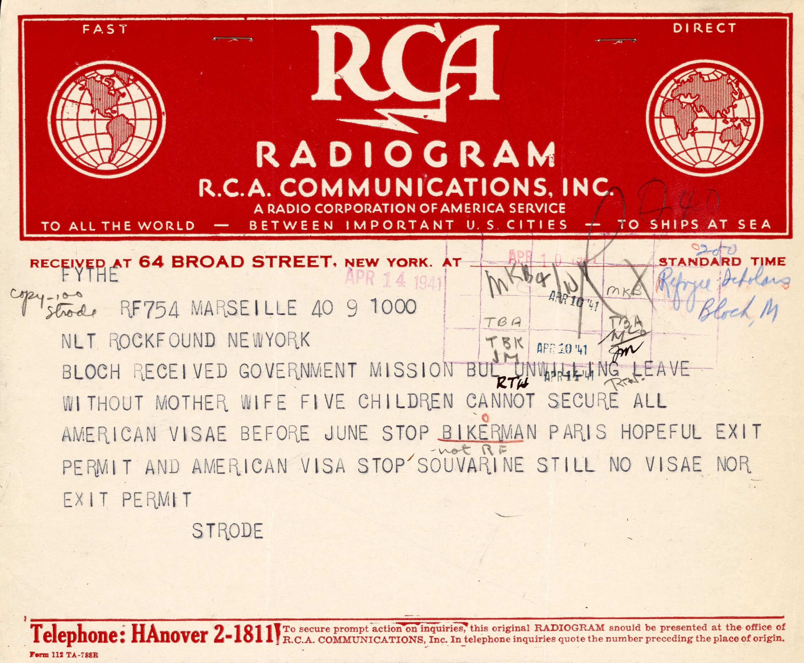 In 1941 the French government passed a law prohibiting French males between the ages of eighteen and forty years old from leaving Paris. Bloch’s eldest sons fell under the new law. On July 31, 1941, Bloch wrote to Alvin Johnson at the New School for Social Research, updating him of the situation and informing him that he and his wife felt that they could not leave their sons behind.