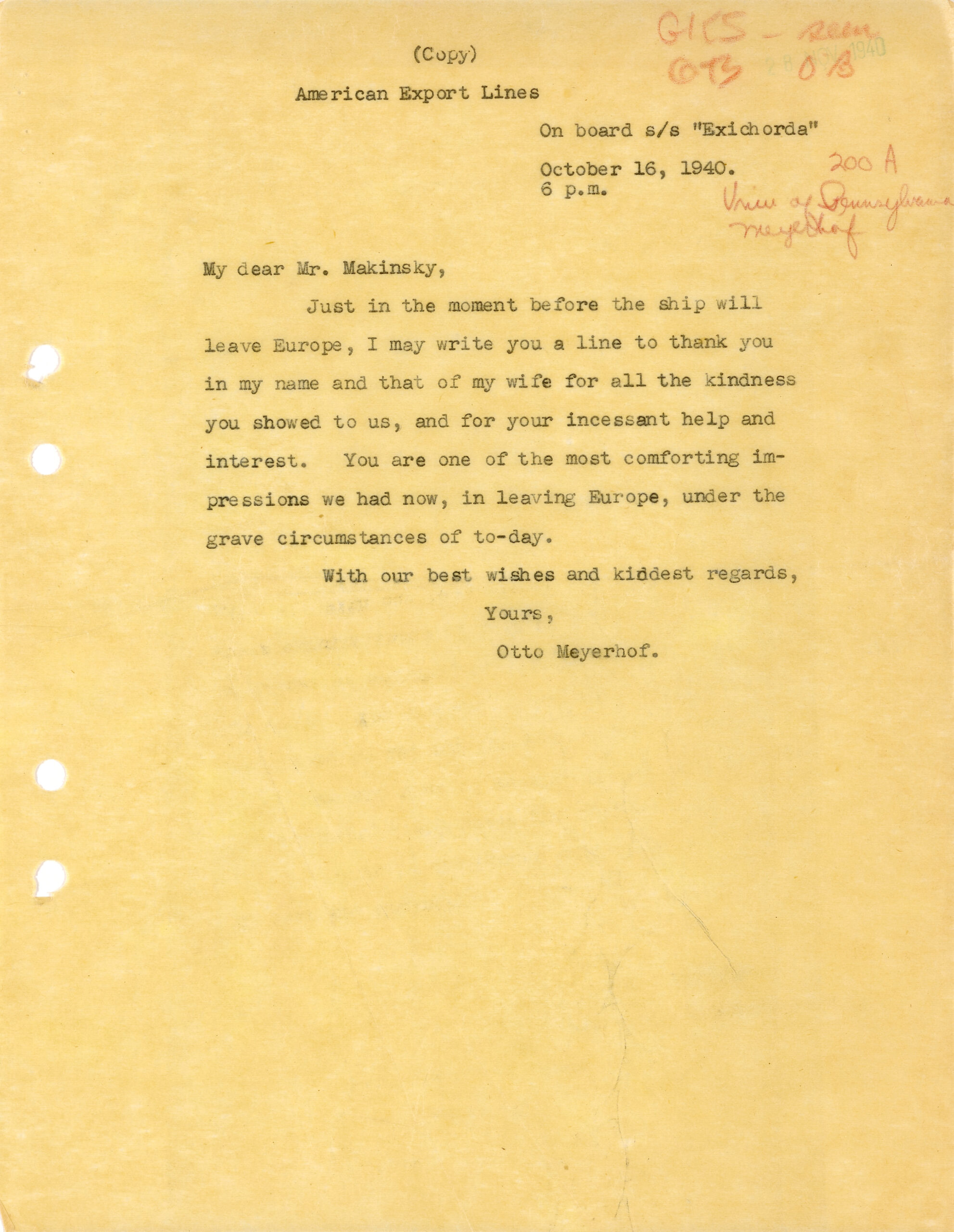 From Spain, Meyerhof and his wife traveled to Lisbon, where they boarded a ship to the United States. On board the SS Exichorda Meyerhof penned a note of thanks to Makinsky, writing:
