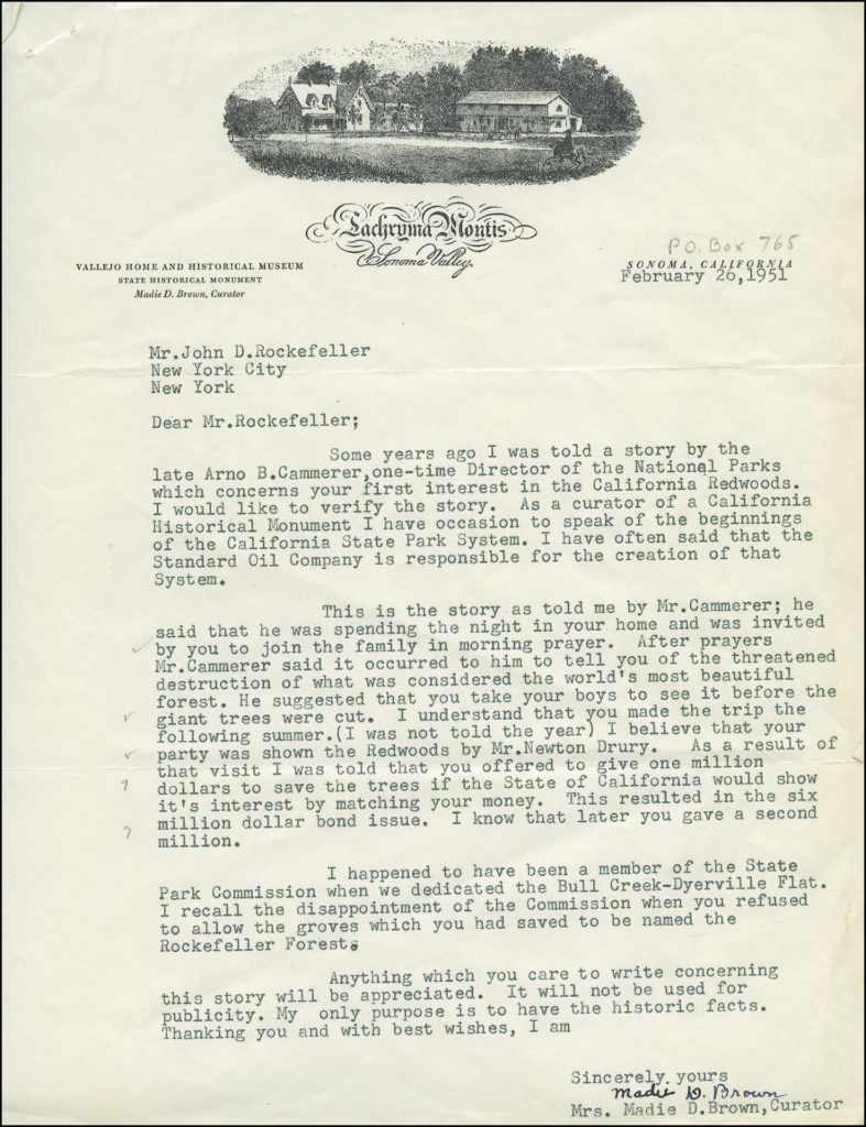 A letter from the curator of the Vallejo Home and Historical Museum to John D. Rockefeller, Jr., verifying his role in saving the California redwoods