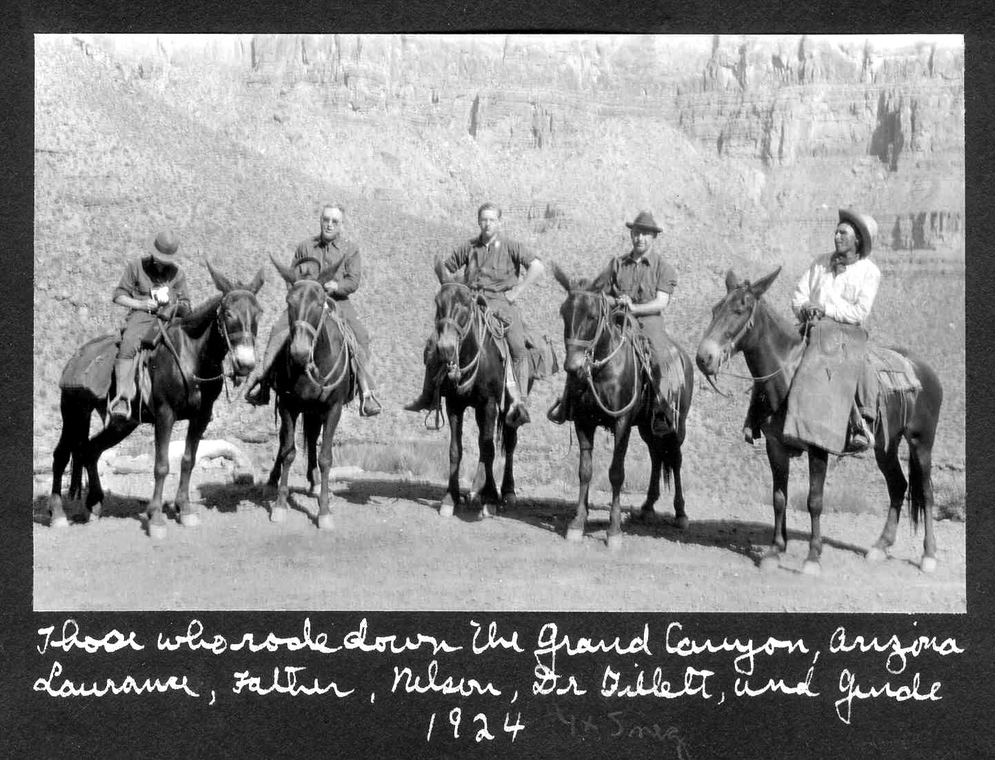 John D. Rockefeller, Jr. (second from left) with sons Laurance (looking down), Nelson (center) and companions at the Grand Canyon in Arizona, 1924. This page is taken from son John D. Rockefeller 3rd’s trip scrapbook.