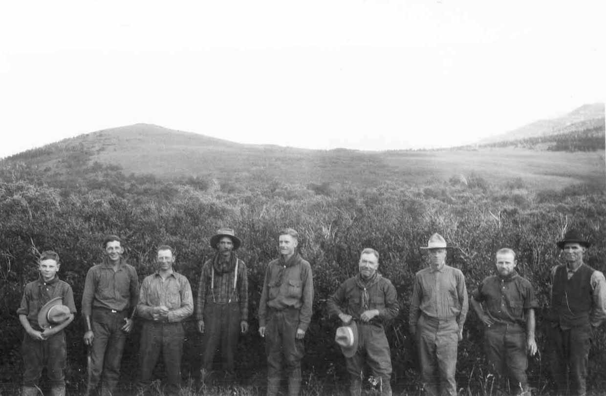 John D. Rockefeller, Jr. (sixth from left) with sons Laurance (left) and John D. 3rd (center) and companions in the American West, 1924